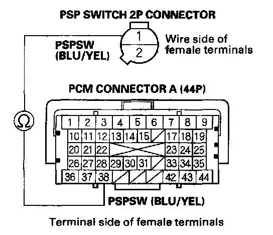 22. Check for continuity between PCM connector terminal A38 and PSP switch 2P connector terminal No. 1.