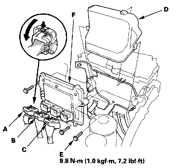 10. Remove the bolts (E), then remove the PCM (F).