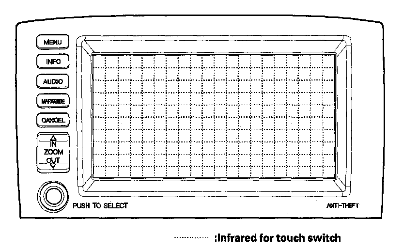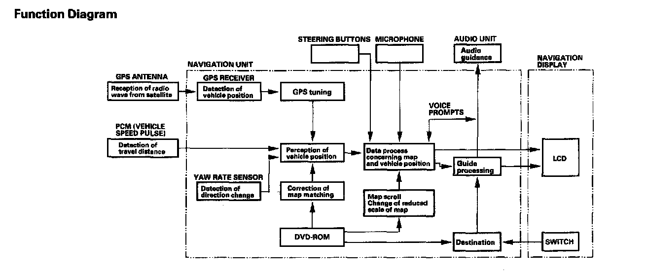 The navigation unit calculates the vehicle position and guides you to the destination. The unit performs map matching correction, GPS correction, and distance tuning. It also controls the menu functions, the DVD-ROM drive, the back-up camera, and interprets voice commands. With control of all these items, the navigation unit makes the navigation picture signal, then it transmits the signal to the navigation display and audio driving instructions to the audio unit.
