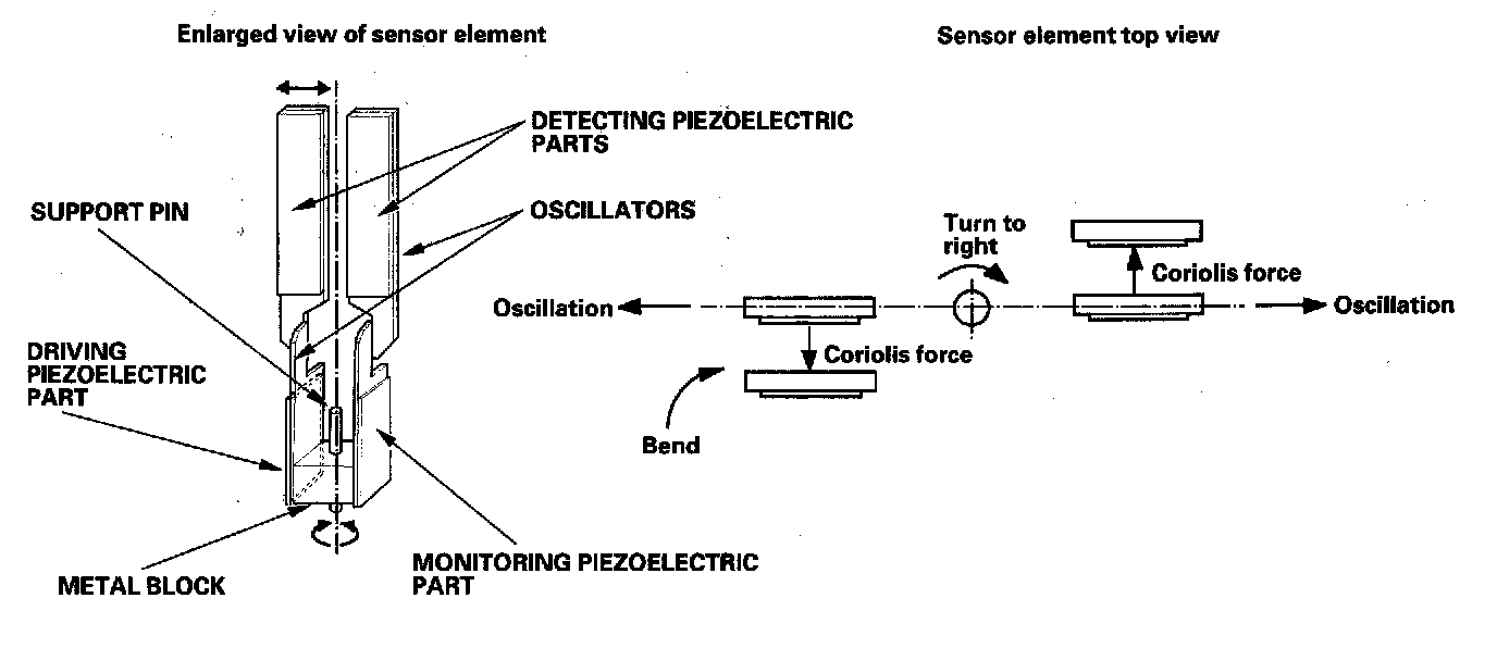 The piezoelectric parts have "electric/mechanical transfer characteristics." They bend vertically when voltage is applied to both sides of the parts, and voltage is generated between both sides of the piezoelectric parts when they are bent by an external force. The oscillation gyro functions by utilizing this characteristic of the piezoelectric parts and "Coriolis force." (Coriolis force deflects moving objects as a result of the earth's rotation.) In the oscillation gyro, this force moves the sensor element when angular velocity is applied.