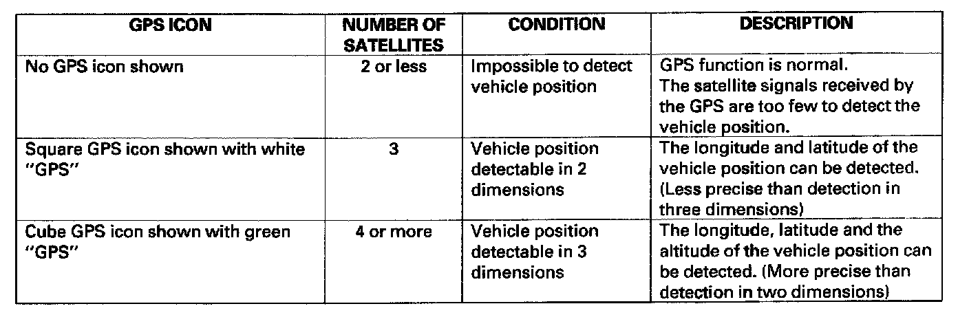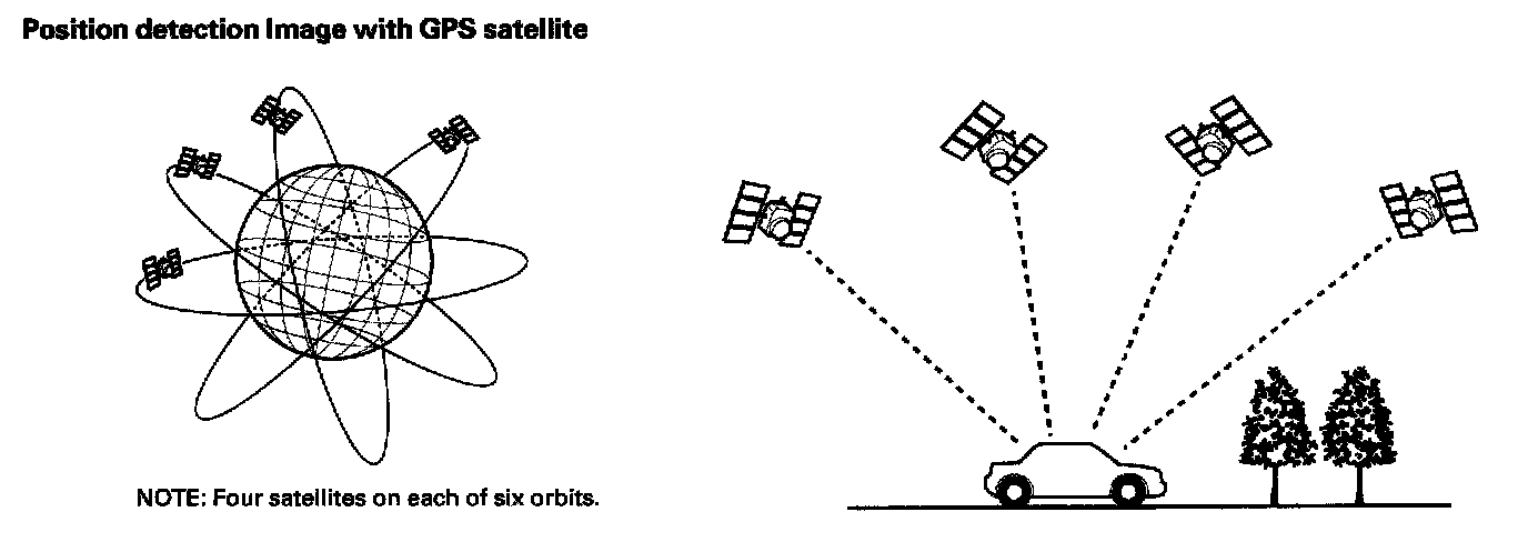 The global positioning system (GPS) enables the navigation system to determine the current position of the vehicle by using the signals transmitted from the satellites in orbit around the earth. The satellites transmit the satellite identification signal, orbit information, transmission time signal, and other information. When the GPS receiver receives a signal from three or more satellites simultaneously, it calculates the current position of the vehicle based on the distance to each satellite and the satellite's positions in its respective orbit.
