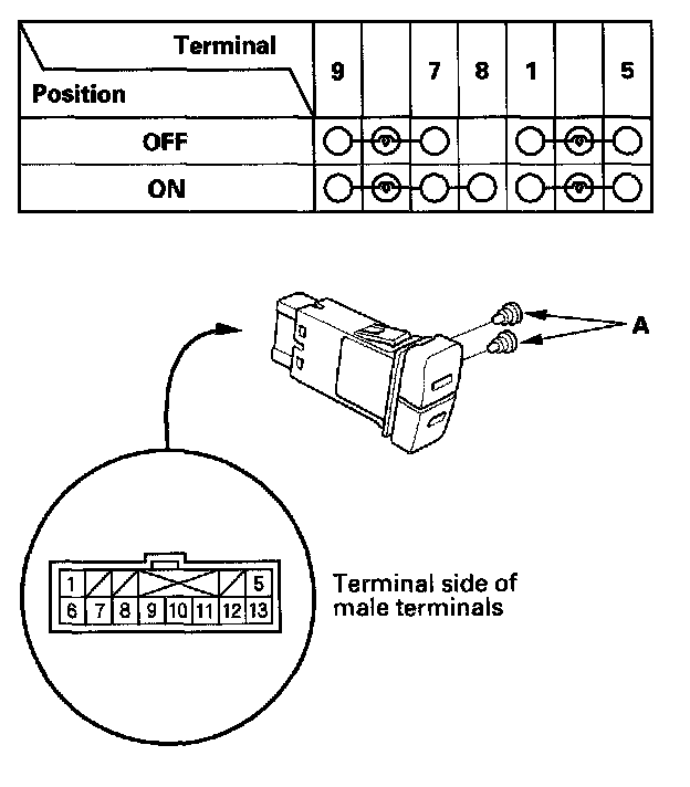3. Check for continuity between the terminals in each switch position according to the table. If there is no continuity, replace indicator bulbs (A) or the switch.