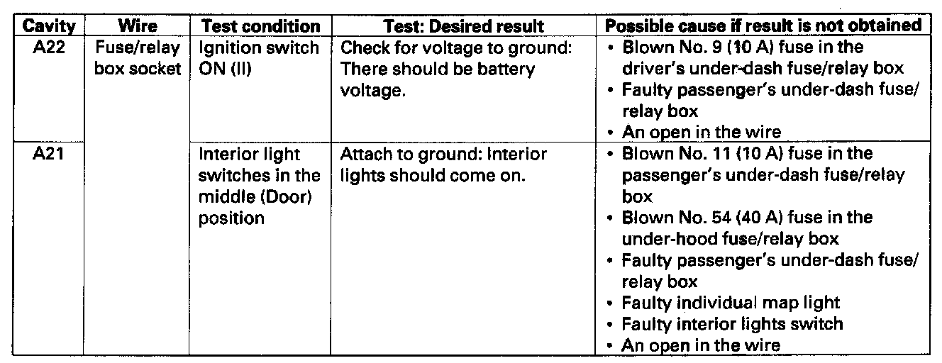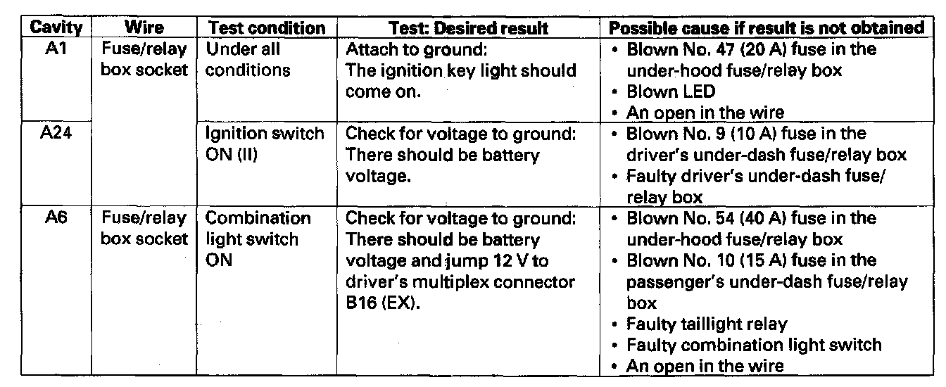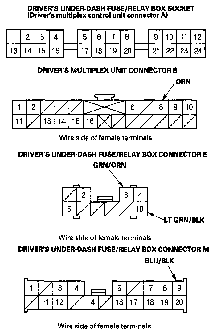 8. With the passenger's multiplex control unit still disconnected, make these input tests at the connector and passenger's under-dash fuse/relay box socket.