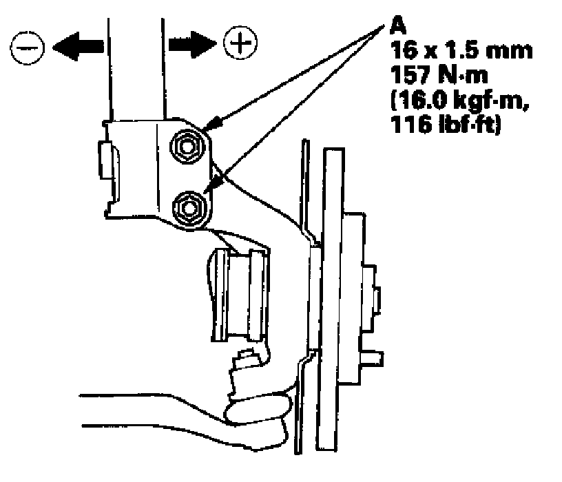 2. Loosen the flange nuts (A) and bolts, and adjust the camber by moving the bottom of the damper within the range of the damper pinch bolt free play. Tighten the flange nuts to the specified torque.