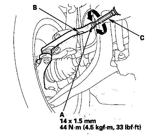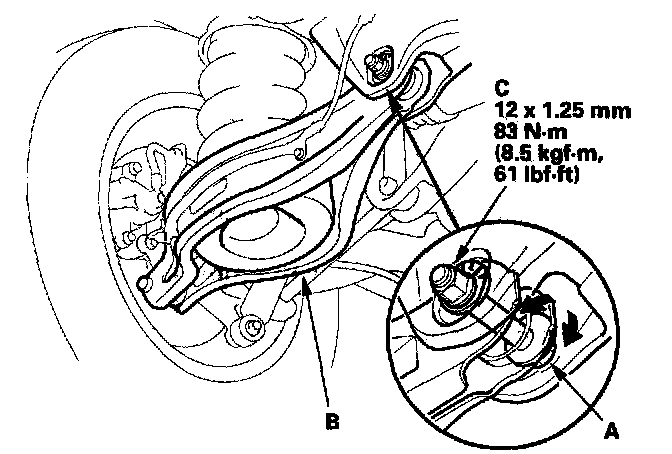 3. Hold the adjusting bolt (A) on the rear lower arm B, and loosen the self-locking nut (C).