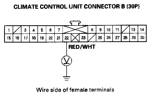 6. Measure the voltage between the No. 22 terminal of climate control unit connector B (30P) and body ground.