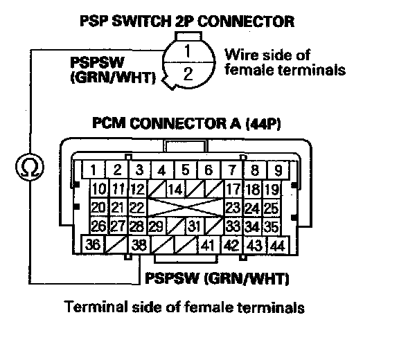 22. Check for continuity between PCM connector terminal A38 and PSP switch 2P connector terminal No.1.