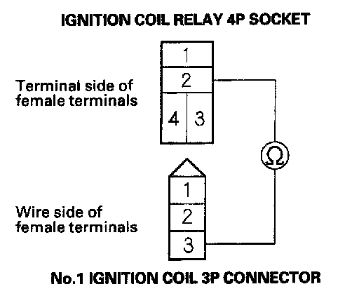 4. Check for continuity between ignition coil relay 4P socket terminal No. 2 and the No. 1 ignition coil 3P connector terminal No. 3.