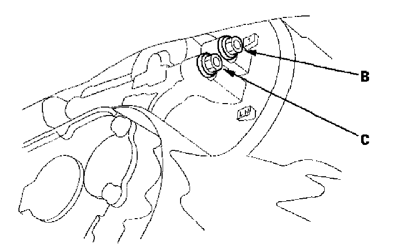 14. Measure the 1 at clutch pressure at the 1st clutch pressure inspection port (B) and the 1st-hold clutch pressure at the 1st-hold clutch pressure inspection port (C) while holding the engine speed at 2,000 rpm.