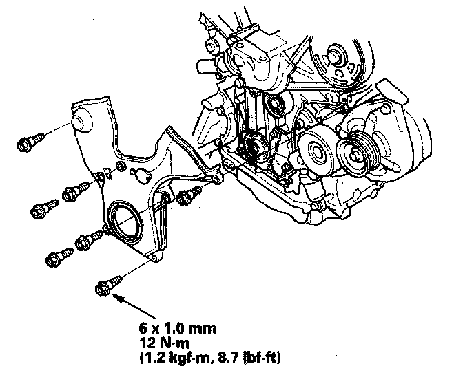 2 Mark the bolt head (D) and crankshaft pulley (E) as shown, then tighten the bolt an additional 60° (The mark on the bolt head lines up with the mark on the crankshaft pulley).