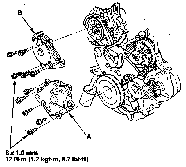 1 Hold the pulley with the holder handle (A) and holder attachment (B), then tighten the bolt to 64 Nm (6.5 kgf-m, 47 ft. lbs.) with a torque wrench and a 19 mm socket (C).