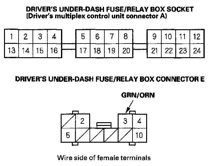 4. With the passenger's multiplex control unit still disconnected, make these input tests at the passenger's underdash fuse/relay box socket.