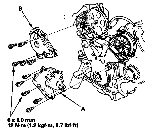 - 1 Hold the pulley with the holder handle (A) and holder attachment (B), then tighten the bolt to 64 Nm (6.5 kgf-m, 47 ft. lbs.) with a torque wrench and heavy duty 19 mm socket (C).