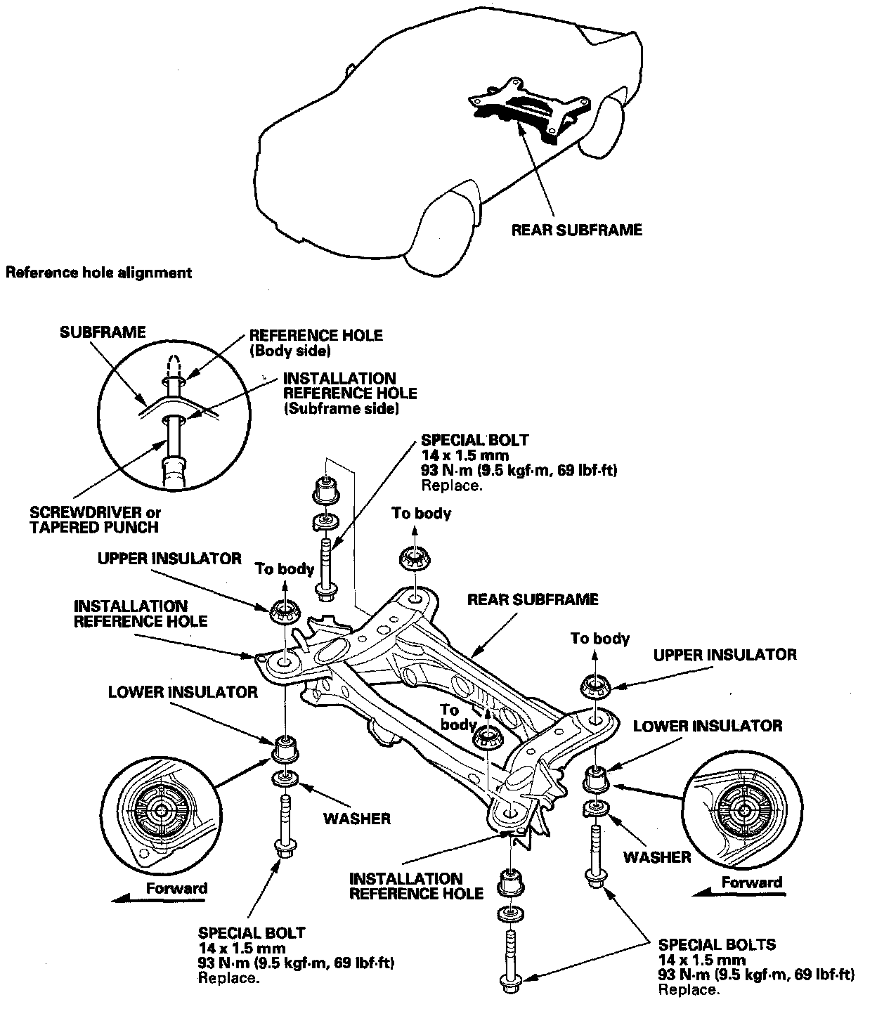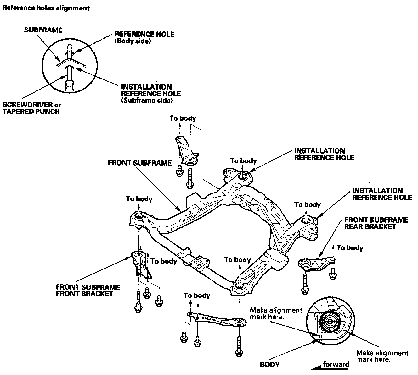 - After mounting the subframe and brackets loosely, align the reference marks with the body, then tighten the bolts.