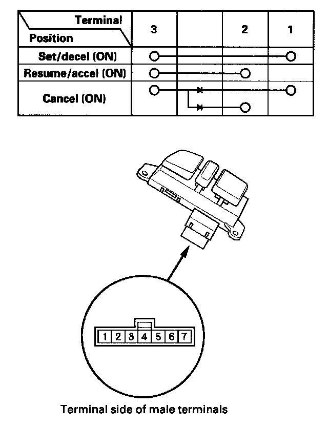 - If there is continuity, and it matches the table, but switch failure occurred on the cruise control input test, check and repair the wire harness on the switch circuit.