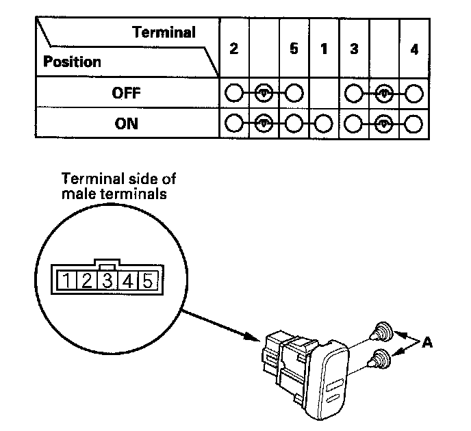 3. Check for continuity between the terminals in each switch position according to the table. If there is no continuity, replace illumination bulbs (A) or the switch.