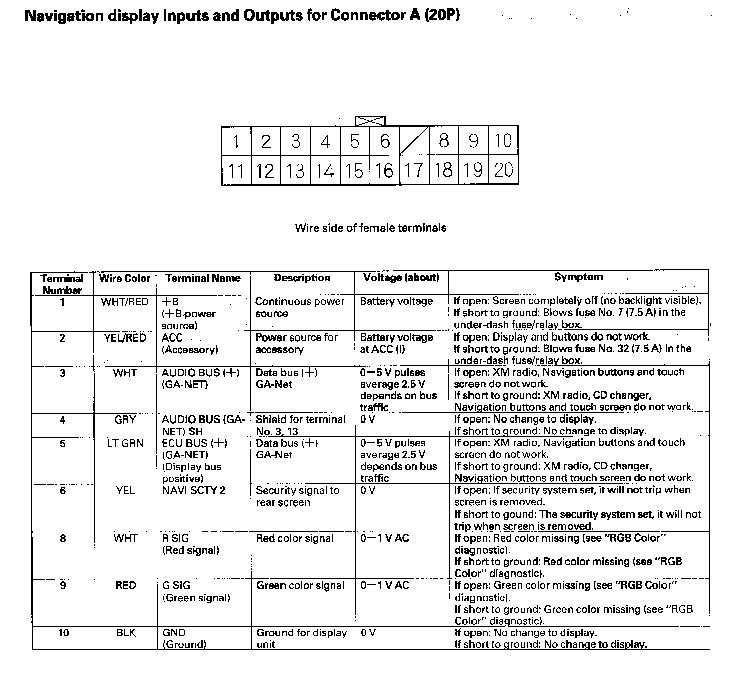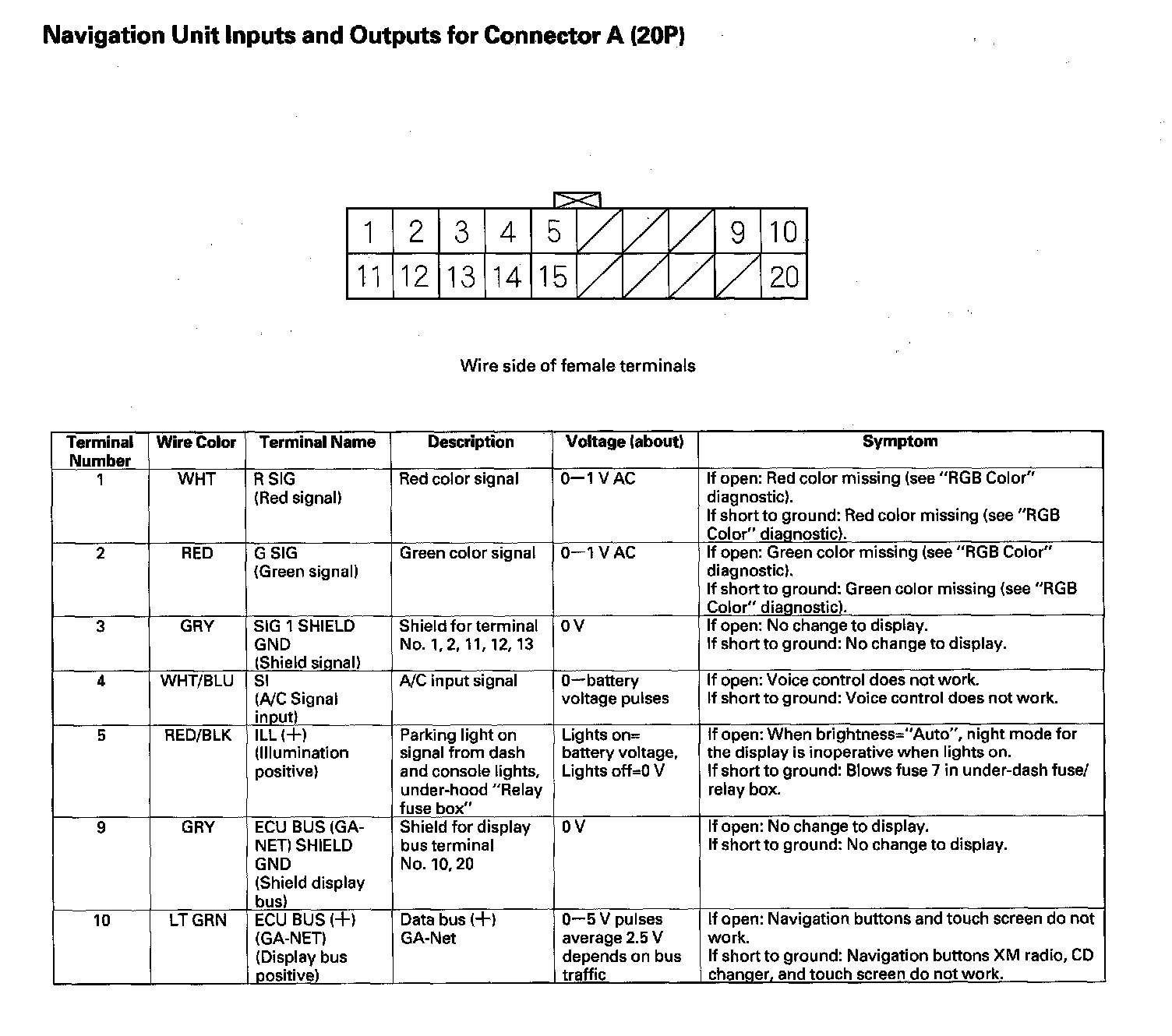 Navigation Unit Inputs And Outputs For Connector A (20P) Part 1: