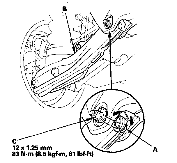 3. Hold the adjusting bolt (A) on the lower arm B, and remove the self-locking nut (C).