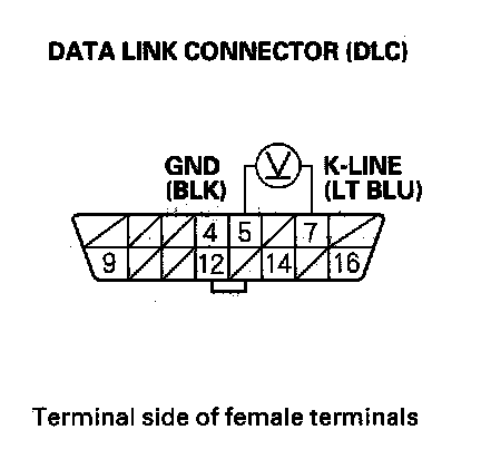 16. Measure voltage between DLC terminals No. 5 and No. 7.