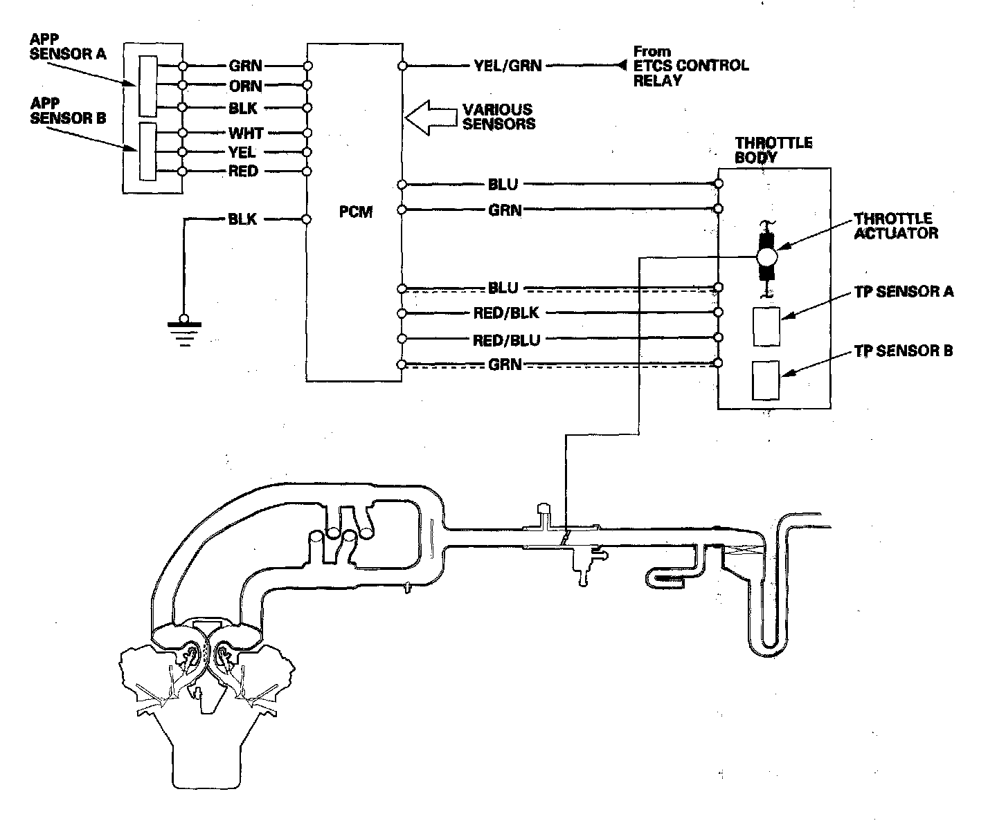 The electronic throttle control system consists of the throttle actuator, throttle position-(TP) sensor A/B, accelerator pedal position (APP)sensor A/B, electronic throttle control system (ETCS) control relay, and the PCM.