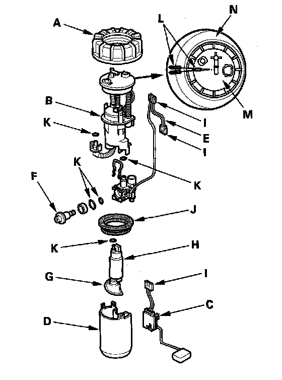 11. Install the parts in the reverse order of removal with a new base gasket (J), new locknut, and new O-rings (K). When installing the fuel tank unit, align the marks (L) on the unit (M) and the fuel tank (N).