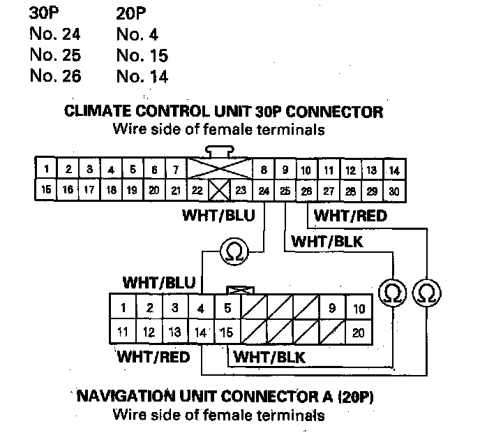 3. Check for continuity between the terminals of the climate control unit 30P connector and navigation unit connector A (20P).