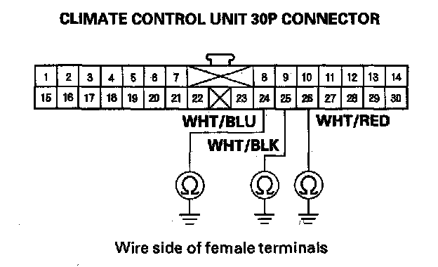 4. Check for continuity between body ground and the climate control unit 30P connector terminals No. 24, 25, and 26 individually.