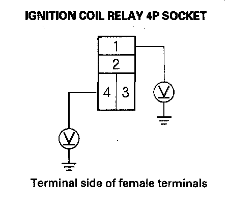 3. Measure the voltage between ignition coil relay 4P socket terminal No. 1 and body ground, then terminal No. 4 and body ground.