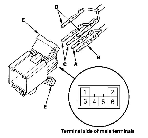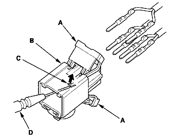 7. Remove the terminal (C) from the connector by pushing the lock tab up in the connector using a thin blade screwdriver (D). Remove all six terminals and replace the connector.
