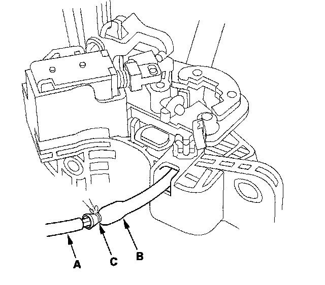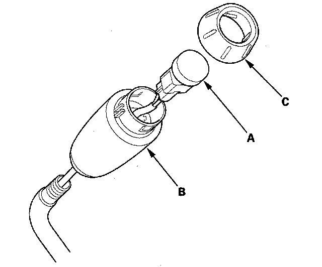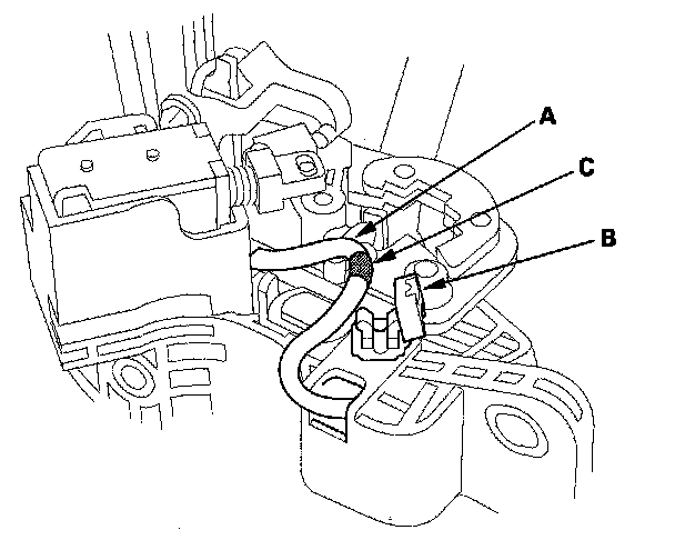 14. Insert the new D3 switch harness wires (A) in the original harness tube (B), then tie a string (C) around the tube to secure the terminals in the tube.