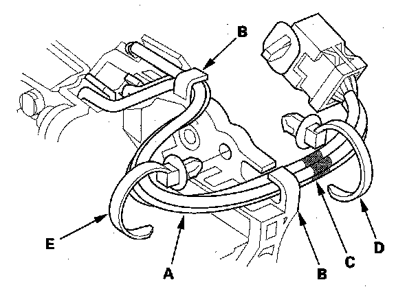 27. Tie the harness together into bundle with new harness clamp, then install the harness clamp (E) on the shift lever bracket.