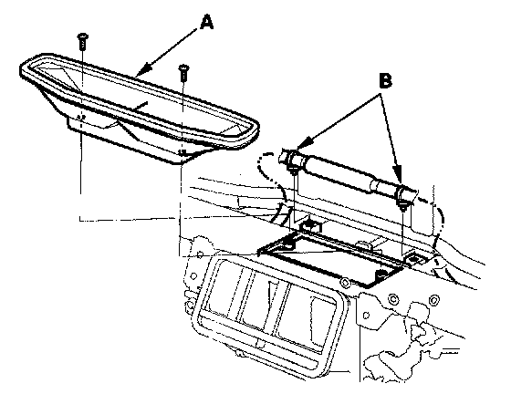 12. Remove the self-tapping screws and the defroster outlet (A), then remove the wire harness clips (B).