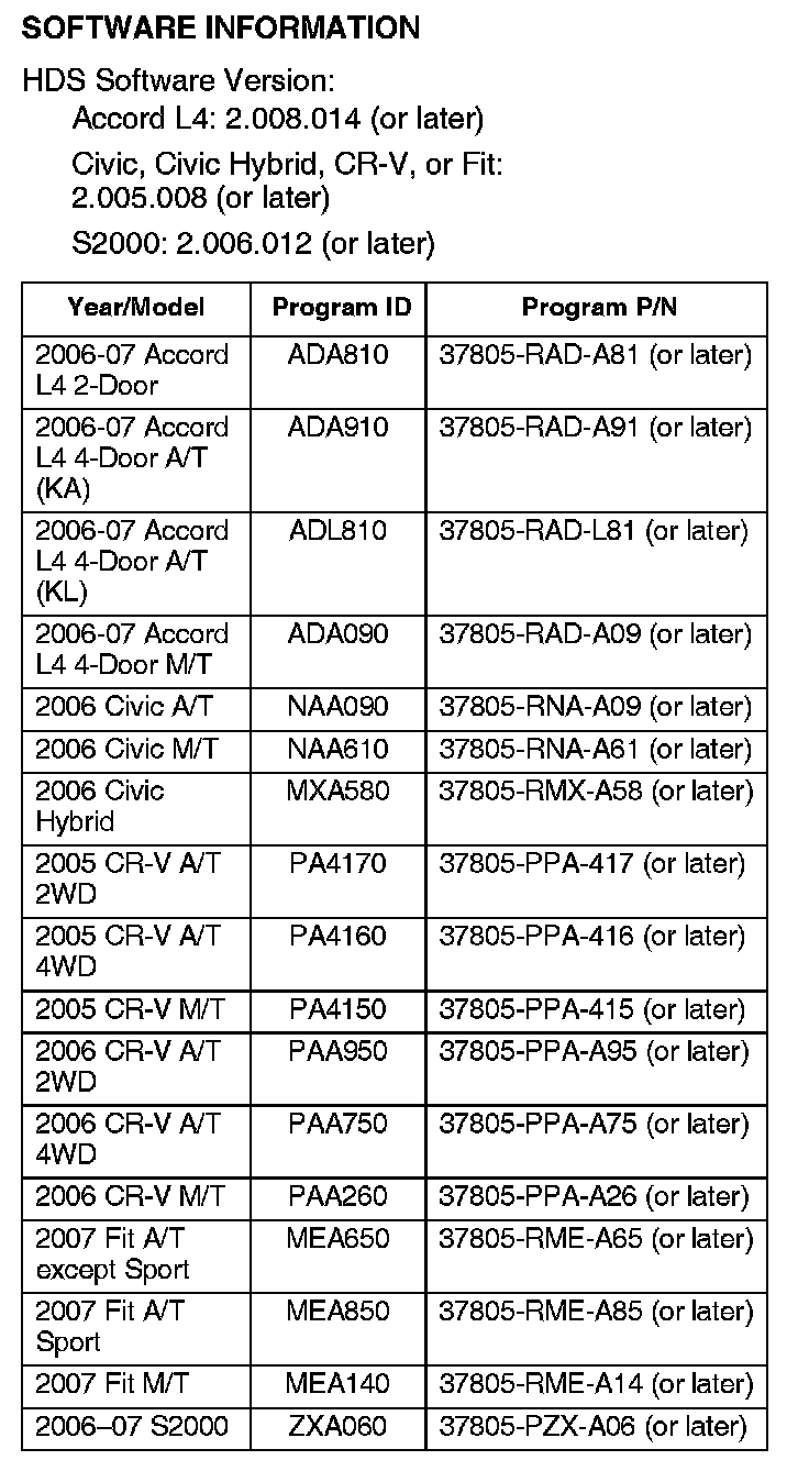 1. Update the PGM-FI software with the HDS. Refer to Service Bulletin 01-023, Updating Control Units/ Modules.