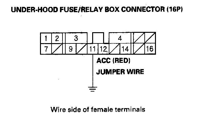 9. Momentarily connect under-hood fuse/relay box 16P connector terminal No. 11 to body ground with a jumper wire several times.