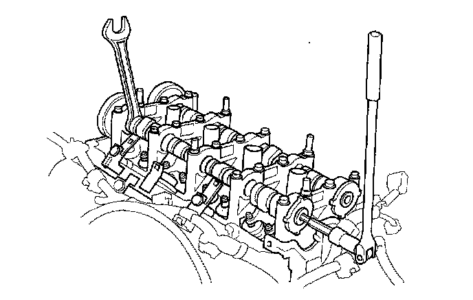 2. Hold the camshaft with an open-end wrench, then loosen the bolt.