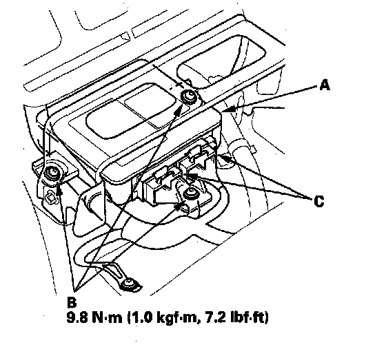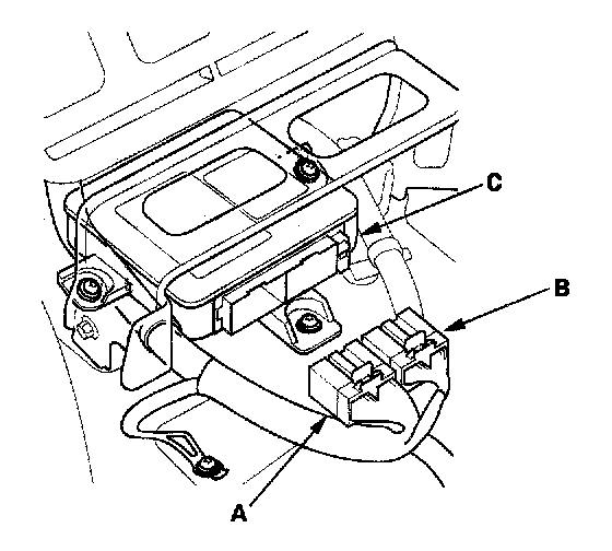1. Install the new SRS unit (A) with new Torx bolts (B), then connect the connectors (C) to the SRS unit; push them into position until they clicks.