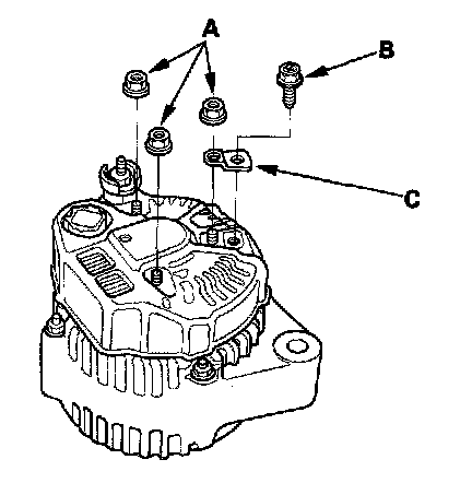 4. Remove the three flange nuts (A) and the screw (B) from the alternator, then remove the plate terminal (C).