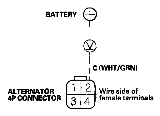 4. Measure the voltage between the alternator 4P connector terminal No. 2 and the positive terminal of the battery.