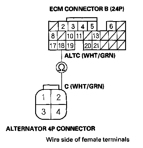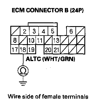 20. Check for continuity between the ECM connector terminal B18 and alternator 4P connector terminal No. 2.