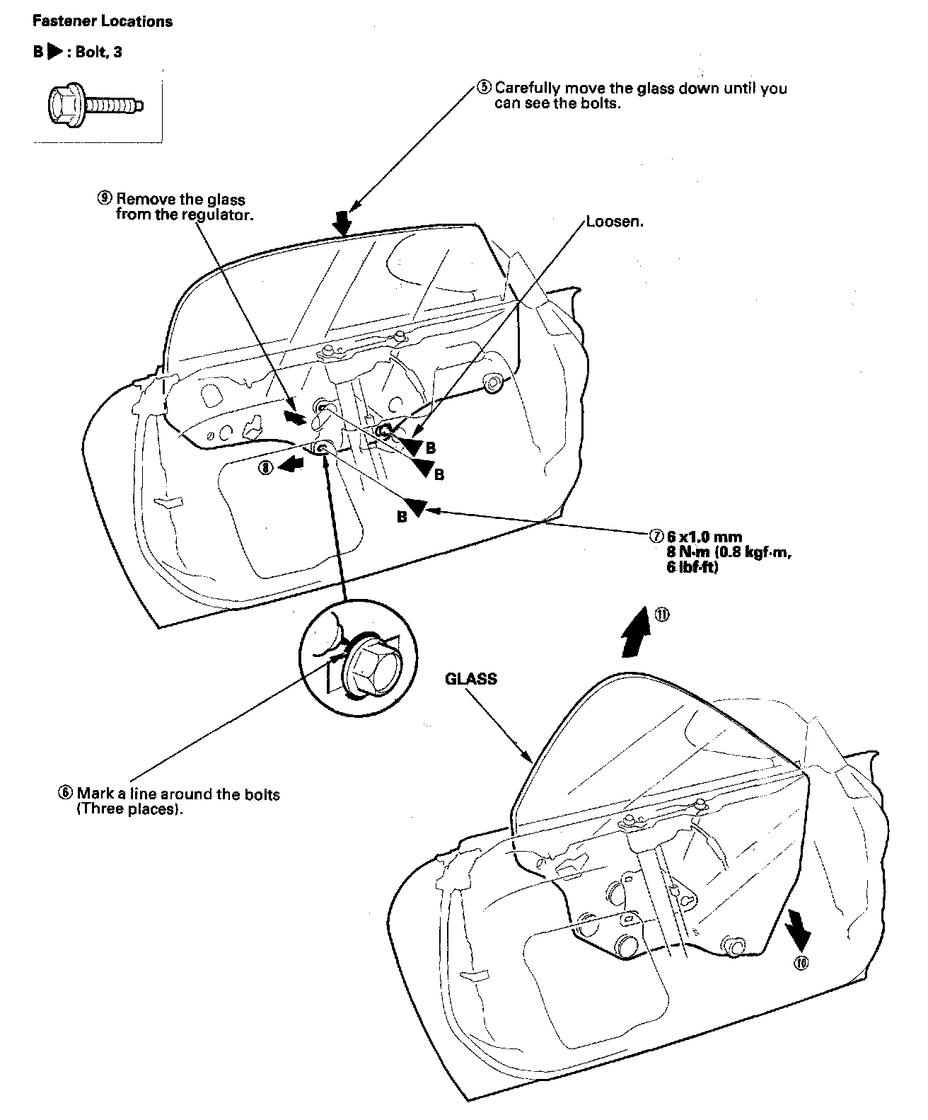 - Mark a line around the stabilizer mounting bolt, the glass mounting bolts, and the regulator mounting nuts to show the original locations.