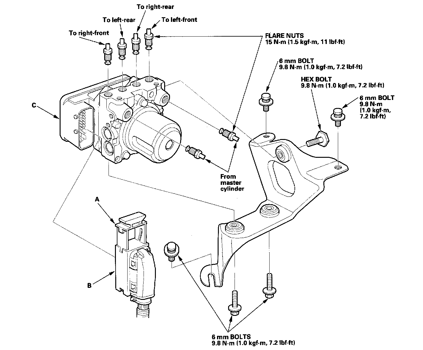 2. Disconnect the six brake lines from the ABS modulator-control unit (C).