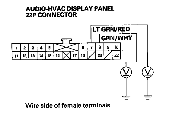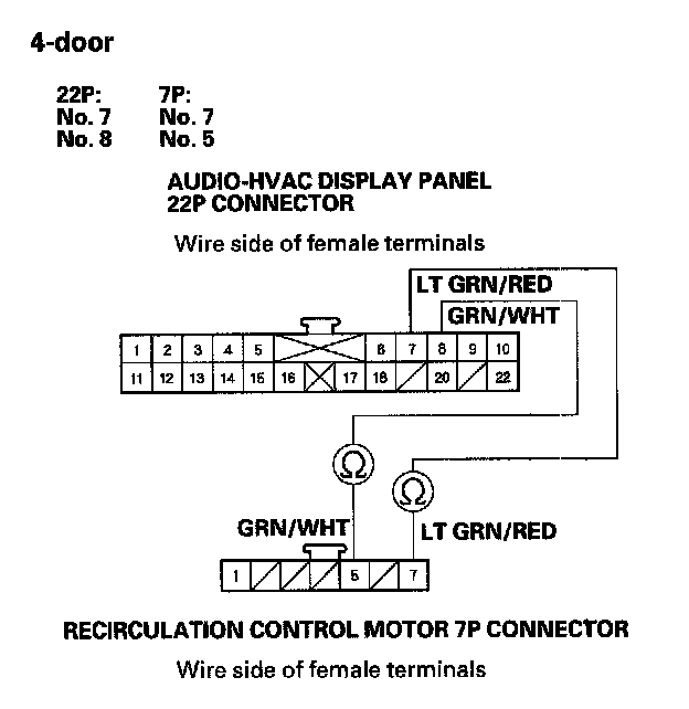 11. Check for continuity between the given terminals of audio-HVAC display panel 22P connector and the recirculation control motor 7P (4-door) or 5P (2-door) connector.