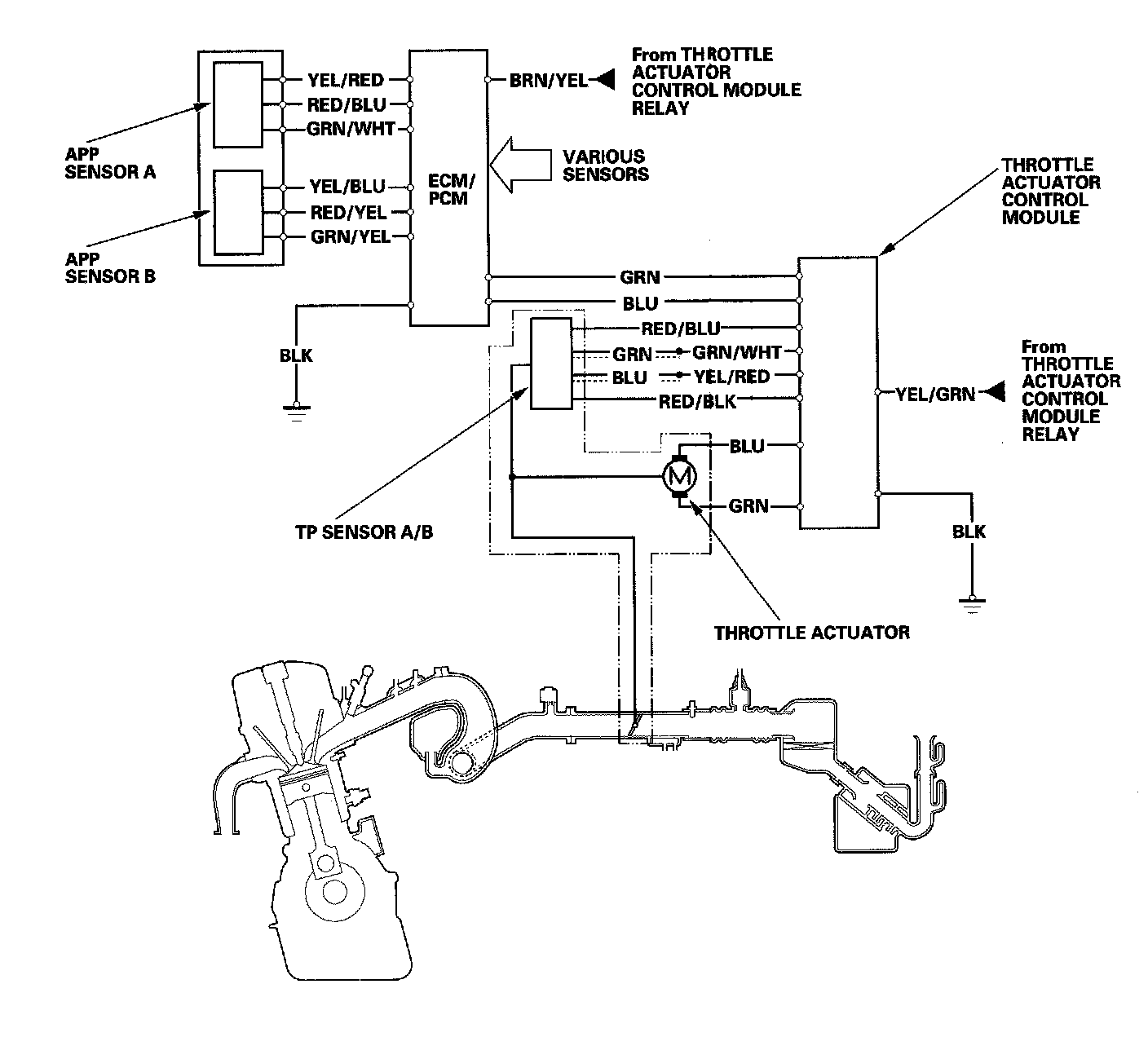 Electronic Throttle Control System Diagram ('06-07 models)The electronic throttle control system consists of the throttle actuator, throttle position (TP) sensor, accelerator pedal position (APP) sensor, throttle actuator control module, and the ECM/PCM. The throttle is electronically controlled by this system.