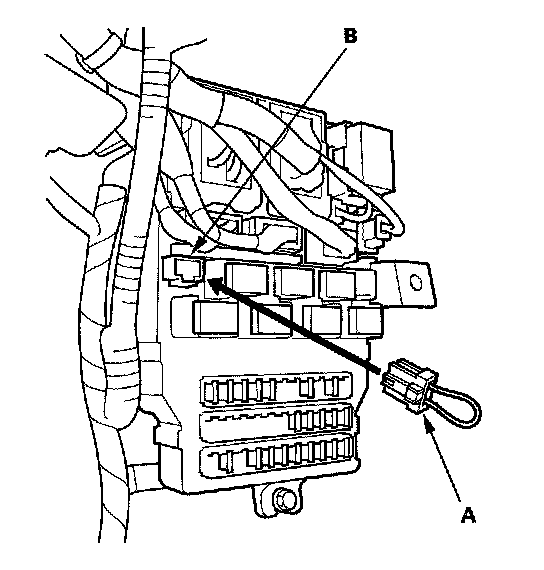 4. Connect the MPCS Service connector (A) to the MCIC socket (B) in the under-dash fuse/relay box.