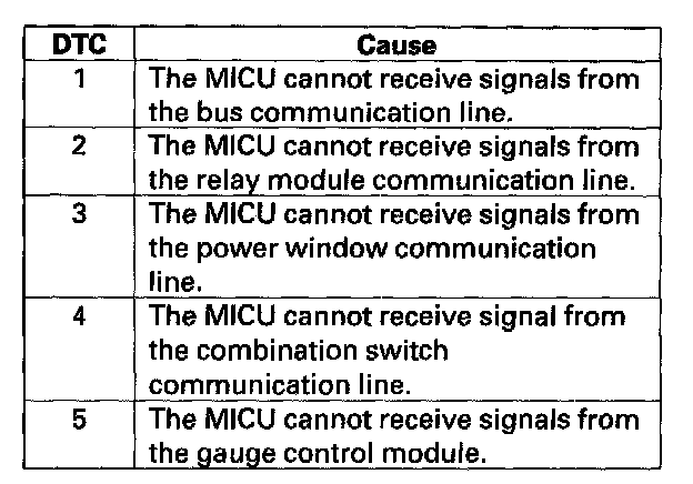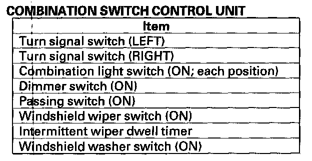 - DTC 4 only (no other DTCs present): Go to the combination switch control unit input test. If all inputs are OK, substitute a known-good wiper/washer switch and then a MICU, one at a time, and then check for DTCs. If a DTC recurs after a substitution, replace that unit.