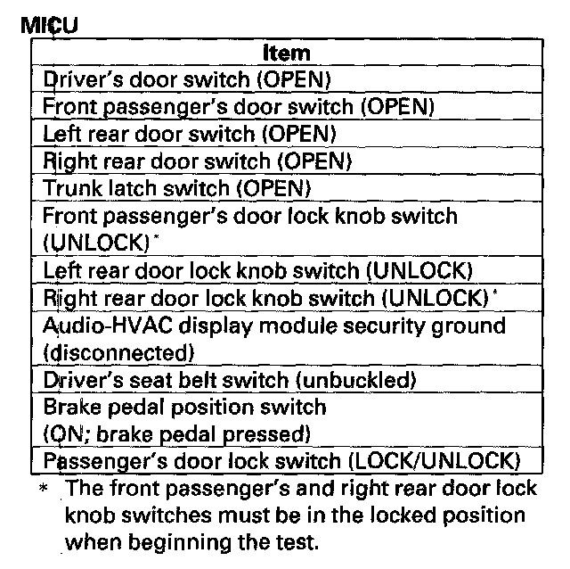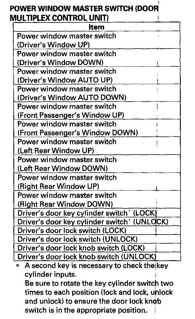 - DTC 3 only (no other DTCs present): Go to the door multiplex control unit input test. If all inputs are OK, substitute a known-good door multiplex control unit and then a MICU, one at a time, and then check for DTCs. If a DTC recurs after a substitution, replace that unit.