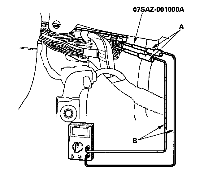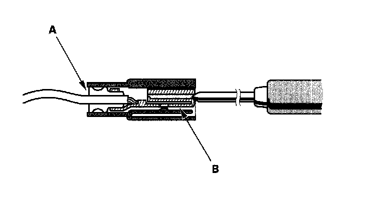 3. If you cannot get to the wire side of the connector or the wire side is sealed (A), disconnect the connector and probe the terminals (B) from the terminal side. Do not force the probe into the connector.