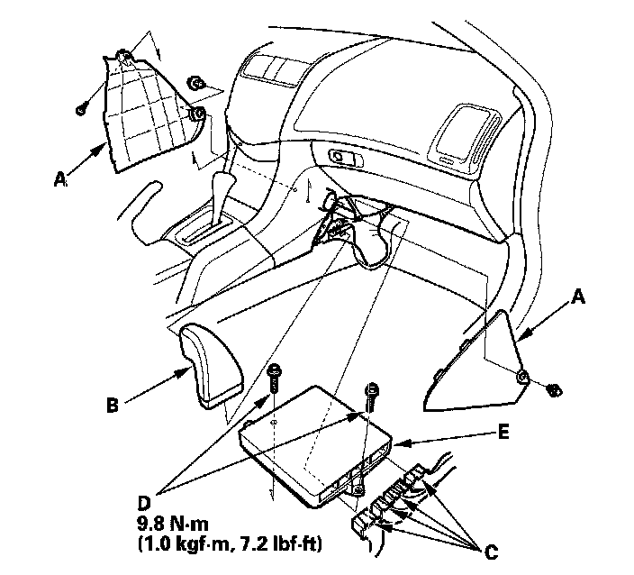 11. Remove the bolts (D), then remove the ECM/PCM (E).