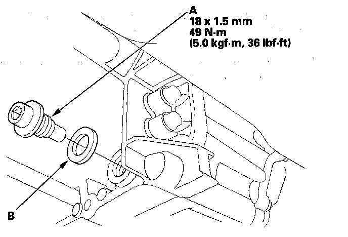 3. Remove the drain plug (A), and drain the automatic transmission fluid (ATF). Then reinstall the drain plug with a new sealing washer (B).