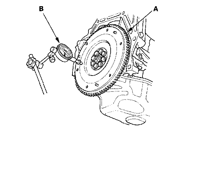 Measure the flywheel (A) runout using a dial indicator (B) through at least two full turns with the engine installed. Push against the flywheel each time you turn it to take up the crankshaft thrust washer clearance. If the runout is more than the service limit, replace the flywheel and recheck the runout. Resurfacing the flywheel is not recommended.